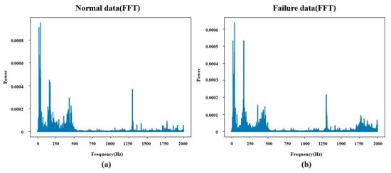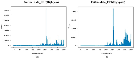 The frequency components of the data were analyzed using FFT, and the results indicated that both normal and fault signals contained significant noise in the high-frequency range above 1000 Hz, as shown in Figure 4. Based on the results of the FFT analysis, the frequency band for high-frequency noise extraction was subsequently set to 1000 Hz.