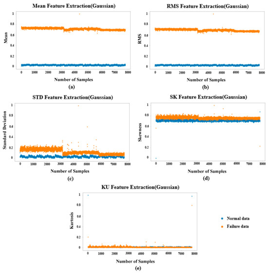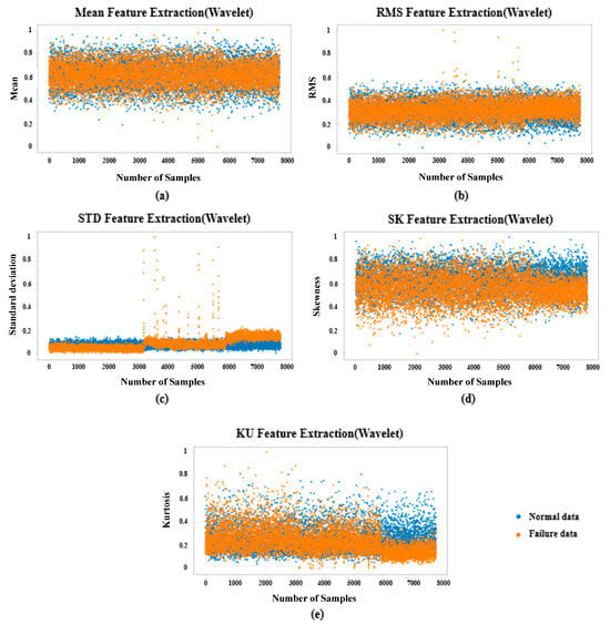 Results of feature extraction-Wavelet ((a): Mean, (b): RMS, (c): STD, (d): SK, (e): KU).