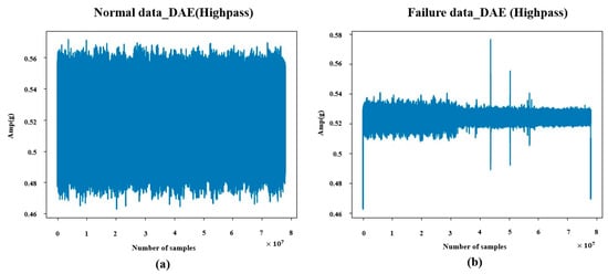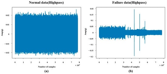 (a) Noise reduction normal data (High-pass). (b) Noise reduction failure data (High-pass).
