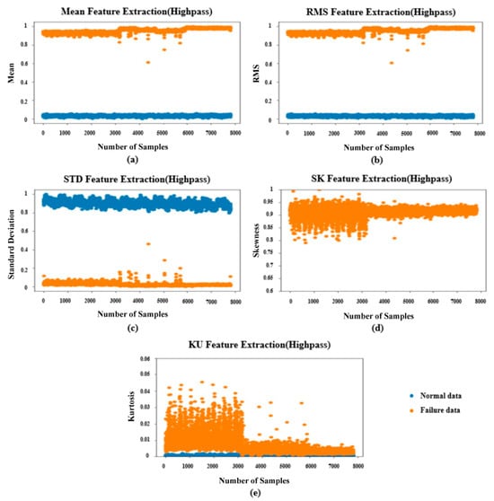 Results of feature extraction-Highpass ((a): Mean, (b): RMS, (c): STD, (d): SK, (e): KU).