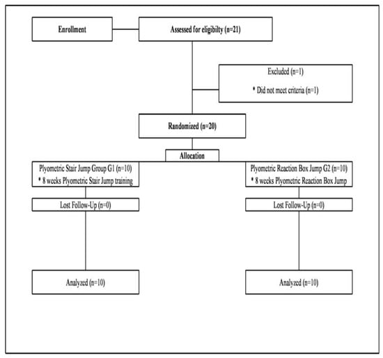 Initially, a total of 21 national-level professional boxers were recruited for the study. The participants held competitive status, were members of the national team, and had achieved gold and bronze medals in national championships. Prior to the study, all athletes received comprehensive written and verbal explanations regarding the study procedures, and written informed consent was obtained. Furthermore, all participants underwent medical examinations at a fully equipped hospital, confirming the absence of medication use, substance influence, or any cardiovascular or metabolic conditions that could impede full participation. Inclusion criteria required that participants (a) had competed as professional boxers in national matches for a minimum of five years, and (b) had engaged in regular boxing training for at least five years, supplemented by at least two years of strength and power training. During the screening process, one participant was excluded due to various reasons such as injury or incompatibility. Consequently, the final sample size included in the analyses was 20. These 20 participants were randomly assigned to two groups using a computer-generated randomization method: the Plyometric Stair Jump group (n = 10) and the Plyometric Reaction Box Jump group (n = 10) (see Figure 1). The randomization process was employed to prevent bias and ensure comparable groups, thereby enhancing the internal validity and reliability of the study results [30].