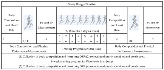 This study employed a pre-test–post-test group design, as shown in Table 1 and Figure 2. The plyometric intervention lasted 8 weeks (32 sessions) and was conducted during the preparatory phase of the athletes’ 32-week competitive season. The participants were randomly assigned to two groups. Group 1, the Plyometric Stair Jump group, consisted of ten male boxers, while Group 2, the Plyometric Reaction Box Jump group, also included ten male boxers. Before commencing training, the Plyometric Stair Jump and Plyometric Reaction Box Jump groups underwent a test involving rapidly kicking as many times as possible within 10 s. Athletes trained for 32 weeks during the pre-season and competition period of the 2022–2023 season (see Table 2 and Table 3). In the 33rd week, both groups were retested to measure their ability to execute as many rapid punches as possible within 10 s. The reliability score for this test was determined to be 0.87, and content validity was confirmed through face validity [31]. The procedures adhered to the latest version of the Declaration of Helsinki and were approved by the ethical committee of Atatürk University Faculty of Sports Sciences, Turkey (RefNo Numbered E-70400699-050.02.04-2200097297, decision 37, dated 2022/3).