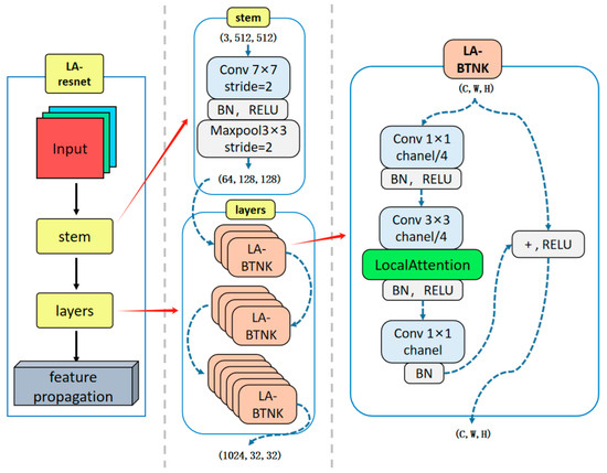 As illustrated in Figure 2, the encoding process begins with a stem module consisting of a 7 × 7 convolution with stride 2, followed by batch normalization, ReLU activation, and a 3 × 3 max pooling layer, effectively reducing the spatial resolution while retaining essential low-level features. Following this, the layers module comprises a sequence of Local Attention Bottleneck Blocks (LA-BTNKs), each of which contains a dimensionality-reducing 1 × 1 convolution, a 3 × 3 convolution applied to the reduced channels, and a final 1 × 1 convolution to restore the original channel dimensions. A Local Attention module is embedded within each LA-BTNK to generate spatial importance maps by emphasizing task-relevant regions and suppressing noise and background clutter. The attention-enhanced features are then reintegrated into the residual path via a skip connection and non-linear activation. Through this hierarchical structure, the LA-ResNet encoder effectively captures semantic representations, which serve as robust feature maps for subsequent feature propagation and decoding stages.