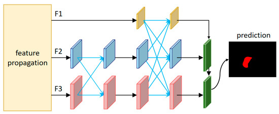 To resolve this limitation, the proposed approach introduces a progressive feature pyramid network (AFPViS) decoder in the decoder part of the LAAVOS network. Inspired by AFPN [19], the AFPViS structure introduces a denser feature fusion mechanism. As illustrated in Figure 4, the feature propagation layer of LAAVOS generates a collection of multi-scale features, encompassing low-level, mid-level, and high-level representations, denoted as {F1, F2, F3}. These features are then progressively integrated by AFPViS, which first fuses the low-level and mid-level features before incorporating the high-level features. Through this fusion mechanism, the semantic disparity across multi-level features is progressively minimized, preventing the degradation and loss of semantic information.