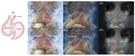 The schematic diagram and video samples of the medaka heart are displayed. (a) shows a simplified ventral schematic of the medaka heart. (b1,c1,d1) present video frame samples from datasets captured under three different environments, while (b2,c2,d2) show the locations of the ventricle and atrium in these sample frames.