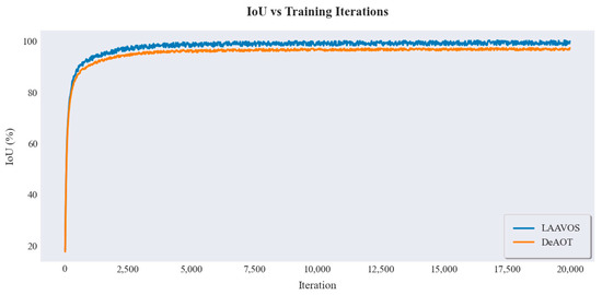 In this experiment, to comprehensively evaluate the performance of LAAVOS during the training process, we systematically recorded its Intersection over Union (IoU) metrics on the validation set and conducted a comparative analysis with the DeAOT model. Specifically, after every 20 training iterations, both LAAVOS and DeAOT were tested on the validation set. Figure 7 illustrates the variation of the IoU metrics with respect to the number of iterations.