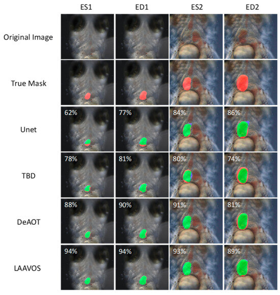 To provide a more intuitive comparison of the segmentation performance across different models, we selected one systolic (ES) frame and one diastolic (ED) frame from test videos captured under two distinct imaging environments. As illustrated in Figure 8, these representative samples display the original images, ground truth masks, and the segmentation outputs produced by the models listed in the previous table. Among them, LAAVOS consistently delivers more accurate and spatially coherent segmentation results across all cardiac phases, demonstrating strong robustness under varying imaging conditions.