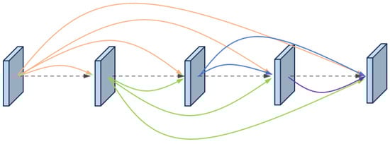 In the equation, represents the non-linear operation consisting of Batch Normalization (BN), ReLU, and convolution operations, and represents the concatenation of the feature maps from the outputs of layers 1 to . The architecture of the dense convolutional module is illustrated in Figure 2.
