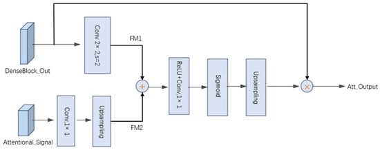 In the equation, denotes a 1 × 1 convolution kernel with ccc filters; represents a 3 × 3 convolution with a stride of 2; and refers to a 1 × 1 convolution kernel with a single filter. The up-sampling operation, denoted as Up, utilizes bilinear interpolation to match the spatial dimensions. As a result, the generated attention map shares the same spatial resolution as the output of the dense module . Subsequently, the attention map is element-wise multiplied with DenseBlock_Out to produce the final output of the attention module.