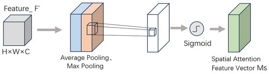 In the equation, σ denotes the sigmoid activation function, Conv represents the convolution operation, average pooling is denoted by the symbol , and max pooling is indicated by . The complete computational procedure is illustrated in the spatial attention module of Figure 5.