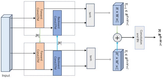 Building upon this foundation, we integrate the Bidirectional Convolutional Long Short-Term Memory (BDC-LSTM) module after the attention mechanism. On one hand, this strategy leverages the salient features enhanced by the attention mechanism as input, allowing the model to focus more effectively on key regions for spatiotemporal modeling. On the other hand, it compensates for the limitations of attention mechanisms in capturing long-range dependencies, thereby improving the model’s ability to recognize lesion morphology variations and ambiguous boundaries. The BDC-LSTM module consists of two independent ConvLSTM branches: a forward branch that processes the feature sequence in chronological order, gradually accumulating information from past states; and a backward branch that traverses the sequence in reverse order , modeling the potential influence of future states on the current state. At each time step, the hidden states from both the forward and backward ConvLSTM branches are non-linearly transformed and fused using a hyperbolic tangent (tanh) activation function, resulting in a more comprehensive spatiotemporal context representation. The detailed process is illustrated in Figure 7. This bidirectional structure enables BDC-LSTM to aggregate feature information from both temporal directions, effectively establishing long-range contextual dependencies and enhancing the consistency of feature representation as well as segmentation accuracy. The corresponding computation is defined in Equation (18).