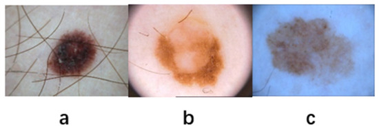 Three samples from the ISIC dataset: (a) contains hair, (b) contains bubbles, and (c) contains shadows.