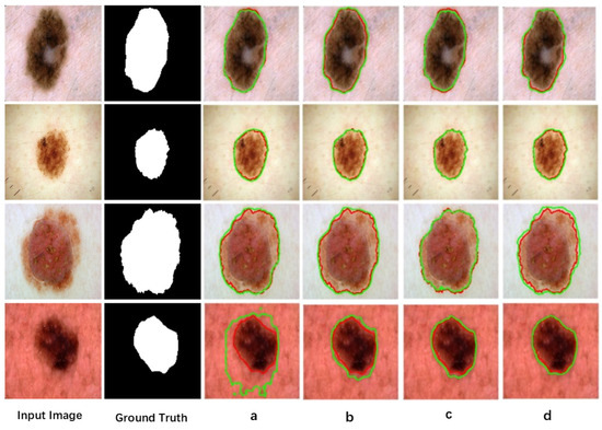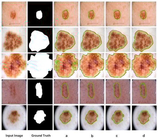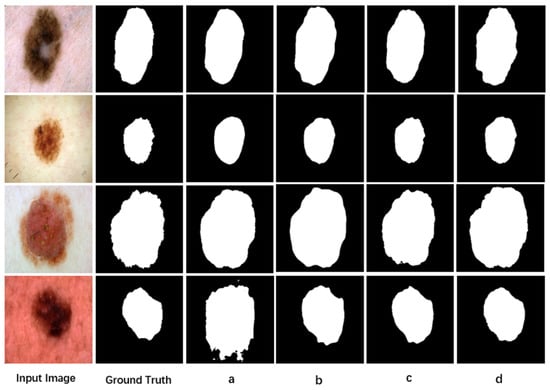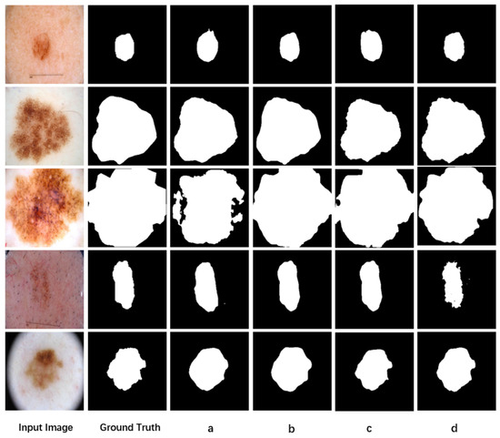 Comparison results on the PH2 dataset. (a) Segmentation result from U-Net; (b) segmentation result from LCAUnet; (c) segmentation result from SCSONet; (d) segmentation result from MA-DenseUNet.