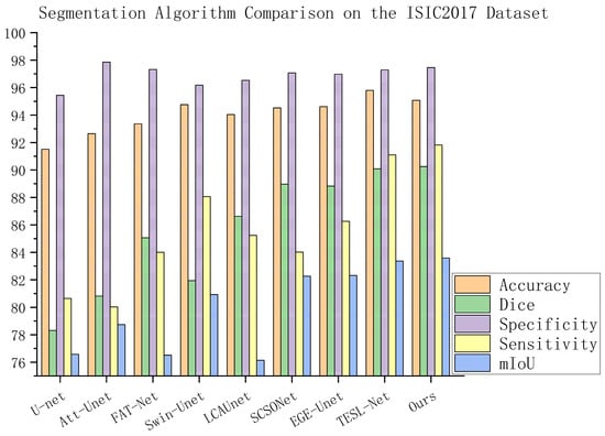 On the ISIC2017 dataset, the proposed method consistently outperforms the baseline U-Net and several state-of-the-art segmentation networks across a range of performance metrics. The experimental results, as summarized in Table 4, provide a comparative analysis of different models based on accuracy, Dice coefficient, mean Intersection over Union (mIoU), and other key evaluation metrics. Specifically, as shown in Figure 12, the proposed method demonstrates an accuracy improvement of approximately 3.5% over the baseline U-Net, and an enhancement of about 0.5% over the current SCSONet. In terms of the Dice coefficient, the proposed model outperforms U-Net by approximately 11.9%, and surpasses SCSONet and TESL-Net by about 1.4% and 0.16%, respectively. For the mIoU metric, the proposed approach shows a notable improvement of approximately 7.0% compared to U-Net, and achieves gains of about 1.3% and 1.27% over SCSONet and EGE-Unet, respectively.
