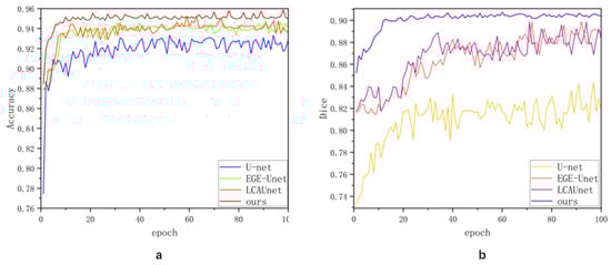 Figure 15 illustrates the variation in the accuracy and Dice coefficients during the validation process as a function of the number of training epochs. As the training progresses, the model gradually converges, exhibiting enhanced stability. Specifically, the fluctuations in the accuracy and Dice coefficients decrease over time, indicating that the model is continuously optimized during the training process, leading to stabilized performance with improved accuracy and robustness. Furthermore, the model’s accuracy and Dice coefficients are significantly higher than those of other comparative models, demonstrating its superiority in the image segmentation task. This suggests that, as training advances, the model not only achieves more accurate segmentation, but also exhibits enhanced adaptability and generalization capabilities.