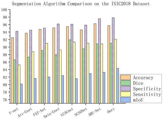 On the ISIC2018 dataset, the proposed MA-DenseUNet model also demonstrates superior performance compared to several state-of-the-art segmentation networks across multiple evaluation metrics. As summarized in Table 5, the experimental results include key performance indicators such as accuracy, Dice coefficient, and mean Intersection over Union (mIoU). Specifically, the proposed method achieves an accuracy improvement of approximately 3.2% over the baseline U-Net and outperforms the SCSONet by around 1.13%. In terms of the Dice coefficient, the model surpasses U-Net by approximately 4.41%, and exceeds SCSONet and ARU-Net by around 1.4% and 0.18%, respectively. For the mIoU metric, the proposed approach improves upon U-Net by about 4.15%, and yields gains of approximately 1.33% and 1.27% over SCSONet and EGE-UNet, respectively. Furthermore, as shown in Figure 16,the MA-DenseUNet model outperforms most comparative methods in other critical indicators such as sensitivity and specificity, further confirming its superior performance in skin lesion segmentation tasks.
