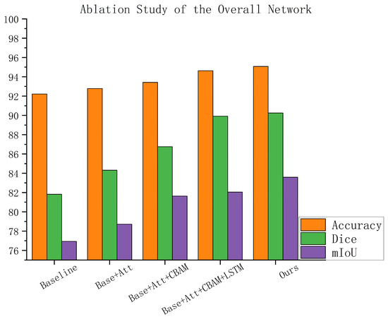 As shown in Figure 17, the components of the proposed network substantially contribute to overall performance enhancement. Beginning with the baseline model, which achieves an accuracy of 92.21%, a Dice coefficient of 81.82%, and a mean Intersection over Union (mIoU) of 80.93%, consistent improvements are observed as each module is progressively incorporated. As shown in Figure 18, the integration of the attention mechanism results in a marked increase in segmentation accuracy, with the Dice coefficient rising to 84.32% and mIoU to 82.71%, highlighting its effectiveness in capturing spatial dependencies. Further enhancement is achieved by incorporating the Convolutional Block Attention Module (CBAM), which elevates the Dice coefficient to 86.76% and mIoU to 83.63%, demonstrating the advantages of combined channel and spatial attention in refining feature representations. The introduction of the Long Short-Term Memory (LSTM) module significantly augments the model’s capability to capture temporal and contextual information, leading to a Dice coefficient of 89.92% and mIoU of 85.05%. Ultimately, the complete model achieves the highest performance, with an accuracy of 95.07%, a Dice coefficient of 90.25%, and mIoU of 86.59%, thereby validating the complementary contributions and necessity of each architectural component.