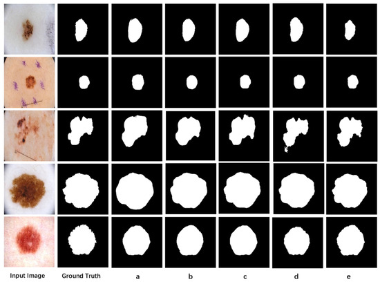 To achieve a more comprehensive and precise evaluation of the segmentation performance across different models, we further conducted an in-depth analysis of the outputs generated by several state-of-the-art networks, as illustrated in Figure 11. For skin lesion images characterized by large background areas and relatively small lesion regions, U-Net and other mainstream models are generally capable of accurately segmenting the principal lesion regions; however, significant discrepancies in boundary delineation remain when compared with the ground truth (as shown in Figure 11a,b). When the lesion occupies a larger proportion of the image, the performance differences among the models become more pronounced. As exemplified in Figure 11a, U-Net tends to exhibit under-segmentation, failing to fully capture the extent of the lesion area. Although LCAUnet and SCSONet demonstrate improvements over U-Net in segmenting the primary regions, LCAUnet produces excessively smoothed boundaries, leading to a loss of fine-grained details, while SCSONet struggles to accurately preserve irregular boundary structures when compared to the proposed MA-DenseUNet. Overall, these visual results substantiate that the proposed MA-DenseUNet can more effectively capture intricate lesion features and suppress noise-induced artifacts, thereby generating segmentation maps that more closely approximate the ground truth annotations.