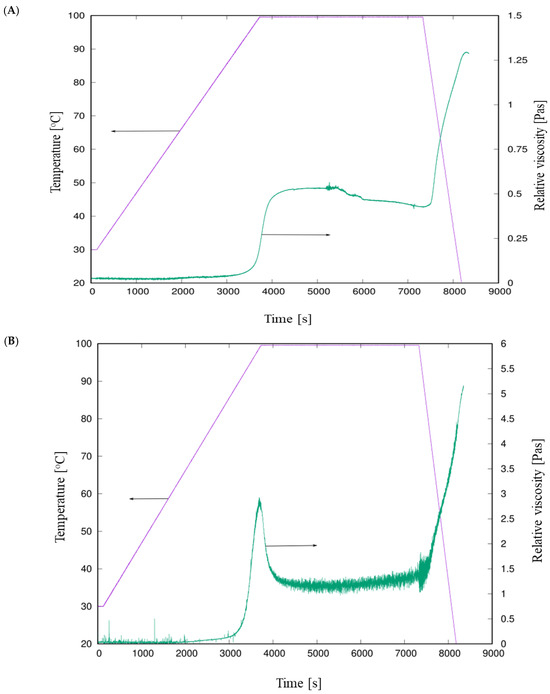 In Figure 1, the Brabender viscosity profiles are illustrated for two rice samples from different harvest years, alongside the applied temperature regime. The temperature profile, depicted by the purple curve, demonstrates the standardized heating and cooling cycles employed for both samples, ensuring comparable experimental conditions. The green curves represent the viscosity profiles of the rice starch suspensions during thermal processing. Sample A (20% amylose, 2020 harvest) exhibits a gradual viscosity increase with temperature elevation, reaching a peak (approximately 0.55 Pa·s) at the point of starch gelatinisation. Subsequently, a decrease in viscosity (approximately 0.13 Pa·s) is observed, indicative of starch granule disruption under prolonged thermal exposure. Upon cooling, a modest viscosity increase (approximately 1.35 Pa·s) is noted. In contrast, Sample B (15% amylose, 2019 harvest) displays a higher peak viscosity (approximately 2.9 Pa·s), followed by a more pronounced viscosity reduction (approximately 1.8 Pa·s) post peak, suggesting enhanced granule breakdown. Both samples show viscosity increases during the cooling phase, with Sample B demonstrating a more significant rise (approximately 5.1 Pa·s).