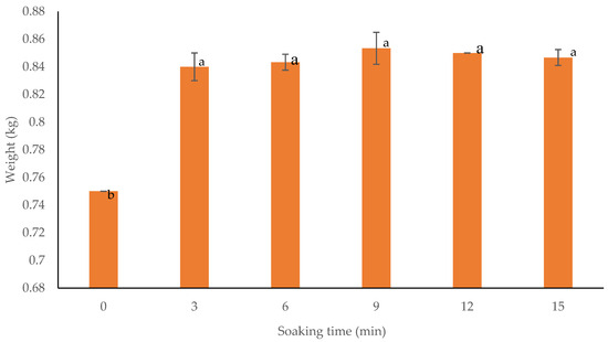 Effect of soaking duration on rice weight gain (kg). Values are presented as means with standard error bars. Bars labelled with different superscript letters indicate significant differences between treatments (p < 0.05).
