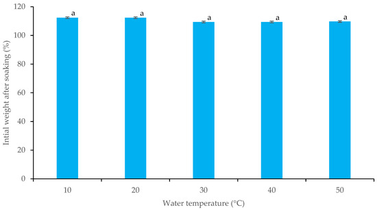 The impact of water temperature on weight gain during rice soaking was investigated by soaking rice in water at temperatures ranging from 10 to 50 °C for 30 min. As illustrated in Figure 3, the initial rice weights after soaking were consistent across all temperature conditions. The uniformity of the results demonstrates that temperature had minimal impact on water absorption.
