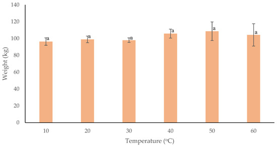 Rice weight gain after soaking in water at different temperatures. Values are presented as means with standard error bars. Bars labelled with the same superscript letters indicate no significant differences between treatments (p < 0.05).