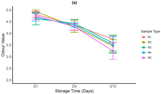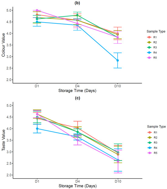 The sensory analysis of differently processed sushi rice samples over a 10-day period are illustrated in Figure 5. Evaluated sensory attributes included odour, taste, texture, colour, appearance, and overall acceptability. The data in the figure allow us to suggest that the water-to-rice ratio used in cooking sushi rice can have impact on odour profile and its changes during storage. This indicates that the rice samples experience a decline in odour quality as they are stored for longer periods. On day one, the different rice samples show varying initial odour values, with R2 having the highest baseline odour and R1 the lowest.