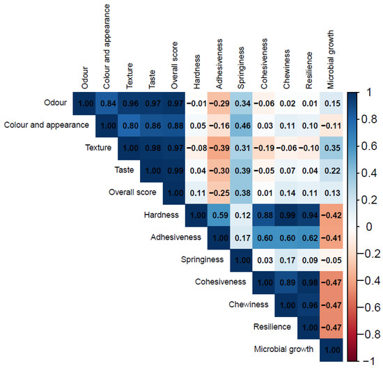 Pearson’s correlation coefficient matrix among different sensory, textural, and microbial properties of sushi rice stored for 10 d in refrigerator.