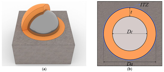 Schematic representation of the resonant inclusion modeled in the study plotted to: (a) Perspective view; (b) Plain view. Explanatory notes: The inclusion consists of a steel core (grey) of diameter , surrounded by a compliant rubber coating (orange) with the thickness embedded within a concrete matrix; the ITZ, depicted in blue, explicitly models the weakened bonding interface; the outer diameter of the resonator, excluding the ITZ, is denoted by . Source: the authors’ own elaboration based on research design.
