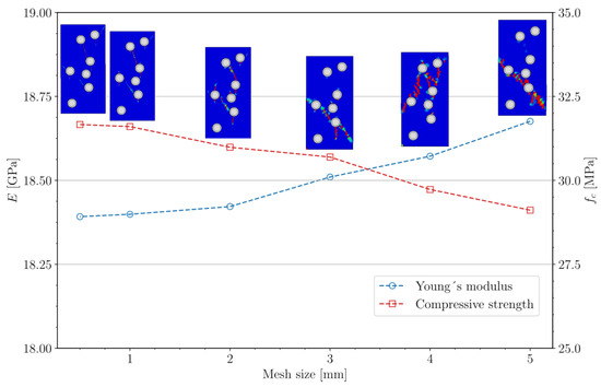 Mesh size sensitivity analysis of Young’s modulus (), compressive strength (), and corresponding cracking patterns derived from the tensile damage variable. Source: own elaboration from numerical calculations.