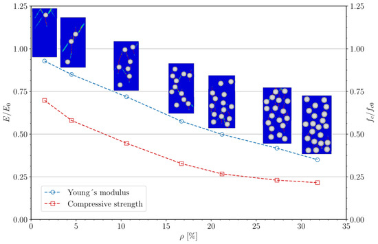 Table 4 presents the mean values, SDs of Young’s modulus and compressive strength, and the number of resonators considered for each resonator ratio. As can be observed, there is little dispersion in the results due to the resonators’ spatial distribution, as evidenced by the low standard deviation (SD) values below 3% for both Young’s modulus and compressive strength.