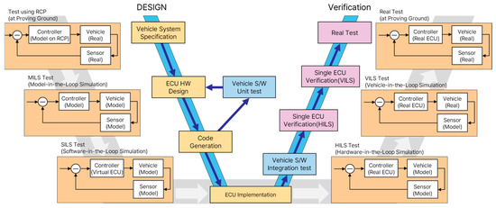 Real-vehicle testing conducted on actual roads offers clear advantages in terms of directly validating systems in real driving situations and naturally reflecting the many variables and uncertainties inherent in real-world environments. However, such testing involves fundamental constraints, including difficulties in ensuring reproducibility, limitations in implementing extreme situations, substantial costs, and safety concerns [9,10,11]. To overcome these limitations, X-in-the-loop simulation (XILS) has been widely adopted, with representative methodologies including model-in-the-loop simulation (MILS), software-in-the-loop simulation (SILS), and hardware-in-the-loop simulation (HILS) [12,13,14].