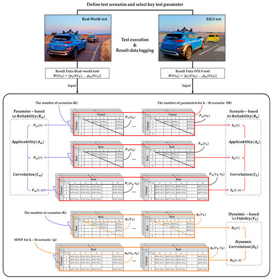 Figure 2 presents the comprehensive three-dimensional credibility evaluation framework for XILS platforms, building upon the reliability assessment methodology established by Oh [31]. The framework illustrates a systematic matrix-based comparison structure that processes similarity calculations between different test configurations (virtual–virtual, real–real, and virtual–real combinations) across multiple dimensions. The core of the methodology centers on structured similarity matrices where each table represents different comparison types indicated by the (virtual, real) labels at the top and left sides. Within each matrix, black-bordered cells represent the similarity comparison results for individual parameters (one of m parameters) between specific test iterations, enabling detailed component-level analysis. Red-bordered horizontal sections encompass the similarity results for all m parameters within a single scenario (one of k scenarios), providing scenario-level aggregated comparisons. Blue-bordered vertical stacks represent similarity results for a single parameter (one of m parameters) across all k scenarios, facilitating parameter-level cross-scenario analysis. These multi-layered matrix structures feed into the three parallel evaluation streams: (1) Parameter-based reliability assessment utilizes the blue-bordered parameter stacks to calculate correlation indices and applicability indices for each of the m key parameters, identifying specific modeling deficiencies in simulation components; (2) scenario-based reliability assessment leverages the red-bordered scenario sections to compute scenario-level correlation and applicability indices, determining replacement feasibility of real-world tests; (3) dynamics-based fidelity assessment employs additional orange-bordered matrices that specifically compare six-degree-of-freedom motion characteristics between virtual and real test configurations, yielding dynamic correlation indices . Validation test scenarios and key test parameters are defined, and data are then collected by performing repeated real-world and XILS tests under identical conditions. The collected data are analyzed across three core dimensions before being integrated into the final credibility assessment.