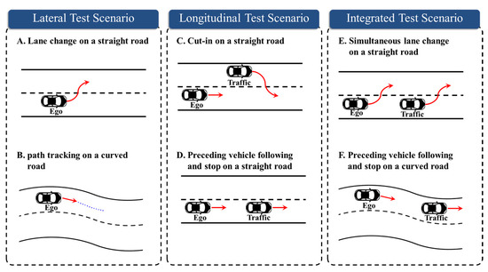 To evaluate the credibility of XILS platforms, the test scenarios and key test parameters must be systematically defined. This section outlines the scenario selection criteria and the key parameters used in the proposed evaluation framework. We constructed six test scenarios based on driving conditions and maneuver types. Based on the control characteristics, these scenarios are categorized into lateral (A and B), longitudinal (C and D), and integrated (E and F) evaluation. Figure 3 illustrates each scenario.