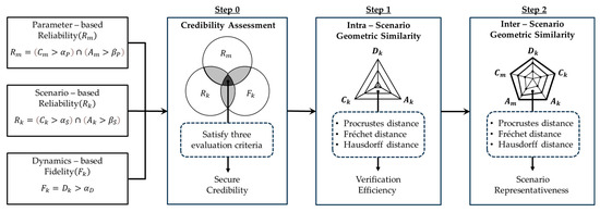 Herein, we propose an efficient credibility verification methodology based on geometric similarity evaluation, as illustrated in Figure 4. In Step 0, three evaluation metrics—parameter-based reliability , scenario-based reliability , and dynamics-based fidelity —are utilized to determine credibility. In Step 1, we evaluate credibility under different speed conditions (low, medium, and high) within the same scenario and visualize the derived evaluation metrics through a spider chart. The geometric similarity between the shapes is analyzed using the Procrustes, Fréchet, and Hausdorff distance techniques. These techniques evaluate the efficiency of the verification process by quantitatively determining whether speed is a dominant factor in the credibility assessment for a given scenario. In Step 2, we additionally evaluate the geometric similarity between different scenarios. This involves verifying whether a particular scenario can represent many other scenarios during credibility assessment.