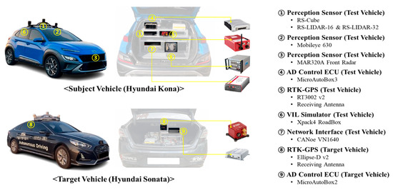 The simulations in this study were performed in a VILS environment built using IPG CarMaker HIL 10.2, a high-fidelity autonomous driving and vehicle dynamics simulation software program. A realistic test environment was implemented using a high-fidelity vehicle dynamics model and an object list-based perception sensor model. Specifically, we focused on evaluating the accuracy of the relative distance and relative velocity to analyze the effects of sensor noise and uncertainty on the performance of the ADS [35,36,37]. This approach contributed to improving the similarity between simulated and actual driving and enhancing the credibility of the evaluation results.