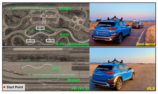 The lateral evaluation scenarios were designed to verify the steering performance and lateral stability of the subject vehicle. Scenario A represents a situation where the subject vehicle changes lanes on a straight road without any external environmental influence, while driving at speeds of 30 km/h, 50 km/h, and 70 km/h. Scenario B evaluates the vehicle’s ability to stably follow a trajectory created based on information provided by the global positioning system (GPS) sensor on an S-shaped road, while driving at speeds of 20 km/h, 40 km/h, and 60 km/h.