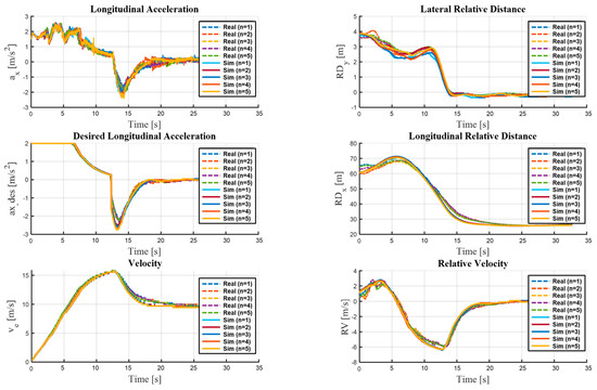 For the longitudinal evaluation scenarios (C and D), we employed longitudinal acceleration (), vehicle speed (), target longitudinal acceleration (), relative longitudinal distance (), relative lateral distance (), and relative speed (RV) as the core evaluation metrics. These measures are paramount for robust evaluation of whether a safe following distance is maintained and if speed is suitably regulated relative to a lead vehicle.