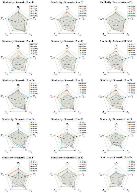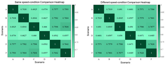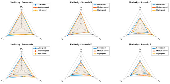 The same-speed comparison involves calculating the geometric similarity between different scenarios by comparing the representativeness vectors of each scenario under identical speed conditions. When the number of scenarios is , the number of possible scenario pairs is , and the comparisons are performed across all three speed conditions for each scenario pair. The geometric similarity under each speed condition is quantified by comparing the representativeness vectors and as shown in Equation (57):