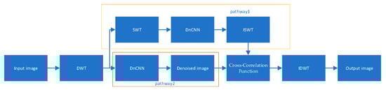 Employing DWT, the image undergoes hierarchical decomposition to isolate and extract specific sub-bands for targeted processing. Subsequently, denoising operations are applied to these sub-bands to enhance signal quality. The processed sub-bands are then reconstructed through the inverse DWT, with final image synthesis achieved via merging in the spatial domain according to Equation (2).