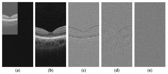 Schematic of DWT: (a) First-order wavelet transform; (b) LL; (c) LH; (d) HL; and (e) HH.