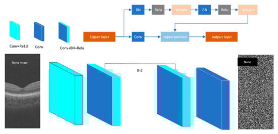 Denoising convolutional neural network (DnCNN) represents a deep convolutional neural network architecture specifically designed for image denoising tasks. This model leverages a deep supervised learning paradigm to adaptively characterize image noise distribution patterns, optimizing network parameters through backpropagation algorithms to achieve nonlinear end-to-end mapping from noisy to clean images. Under Gaussian noise conditions, DnCNN demonstrates superior denoising performance. The optical coherence tomography (OCT) images addressed in this study exhibit Poisson-distributed noise characteristics. To accommodate DnCNN’s input requirements, we apply variance stabilizing transformation (VST) to preprocess raw images via square root operations, converting signal-dependent noise into additive Gaussian noise []. The adopted DnCNN network topology, as illustrated in Figure 4, comprises alternately stacked convolutional layers and batch normalization units, incorporating residual learning mechanisms with skip connections to enhance feature reuse capabilities and further improve denoising efficacy. The network depth is represented by B, with B = 25 employed in the experimental setup. The convolution kernel adopted in the architecture is of size 3 × 3 × 64.