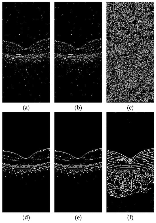 Edge detection on OCT images before and after denoising using Sobel, Prewitt, and Canny: (a) edge detection map of original OCT image using Sobel; (b) edge detection map of original OCT image using Prewitt; (c) edge detection map of original OCT image using Canny; (d) edge detection map of denoised OCT image using Sobel; (e) edge detection map of denoised OCT image using Prewitt; and (f) edge detection map of denoised OCT image using Canny.