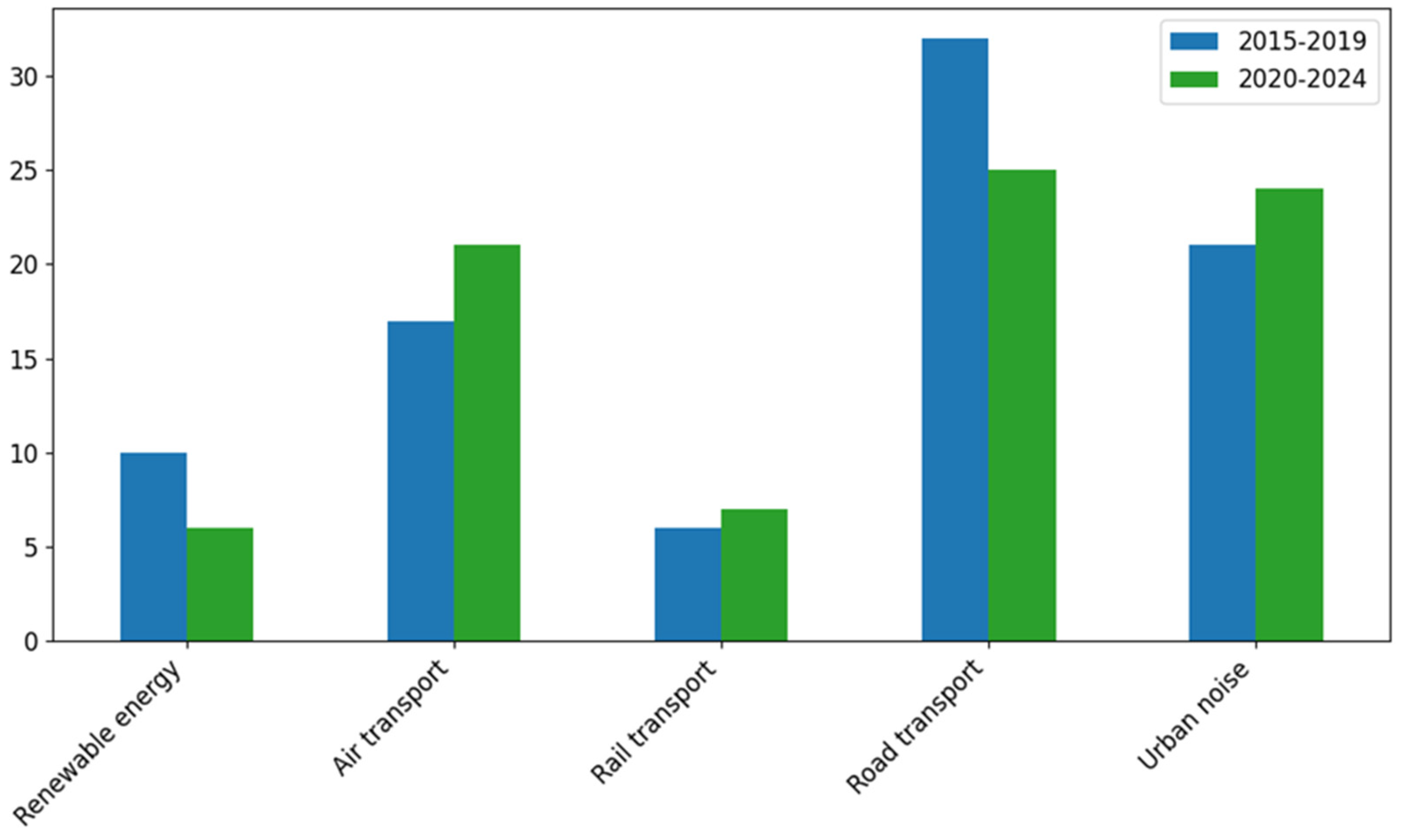 - Noise source—the surveyed articles referred to the following sources of sound: Renewable Energy, Air Transport, Rail Transport, Road Transport, Urban Noise. Regarding Renewable Energy, the category encompasses sources of energy that are naturally replenished. The following noise sources that comprise this category occurred in the articles concerning Wind Farm, Wind Power, Wind Turbine, Wind Turbine Noise, Wind Turbines, Wind Energy, Wind Projects, Wind Turbine Annoyance Assessment, and Wind Turbine Sounds. Another highlighted category was Air Transport, which refers to all modes of transportation that occur above the ground, primarily using aircraft. The articles featuring the following noise sources that make up this category are on Aircraft, Aircraft Noise, Aircraft Landing, Airport, Airports, Air Traffics, Air Traffic Control, Aviation, and Aeroacoustics. Another category highlighted was Rail Transportation, which refers to transportation that occurs on rails, primarily using trains. The following articles featured the following noise sources that make up this category: Railroad Railroads, Railway Transport, and Railroad Transportation. Another category highlighted was Road Transport, which refers to all modes of transportation that occur on roads, including cars, buses, and trucks. The following articles featured the following noise sources that make up this category: Traffic Noise, Road Traffic, Roads and Streets, Road Traffic Noise, Traffic, Traffic Emission, Road Transportation, Transportation System, Vehicles, Noise, and Transportation. Another category highlighted was Urban Noise, which refers to all noise generated within urban environments, including residential, commercial, and industrial areas. The following articles featured the following noise sources that make up this category: Neighborhood, Urban Area, City, Cities, Urban Planning, Urban Environments, Urban Air, Residential Areas, and Housing. In order to better present the breakdowns of the first two categories, they are presented graphically in Figure 2.