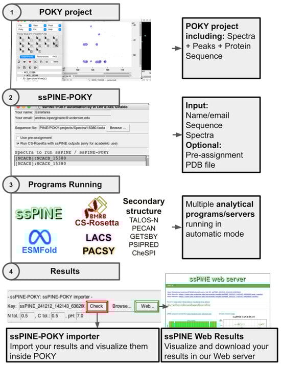 Simplified ssPINE-POKY workflow. The process begins with opening the POKY project, which includes NMR spectra, peak list, and the protein sequence. The user then opens ssPINE-POKY and provides the required input parameters. Upon submission, multiple analytical programs and servers, including ssPINE, are executed automatically. Once the process is complete, results can be reviewed directly within POKY using the “Check” button or accessed via the web-based interface using the “Web…” button.