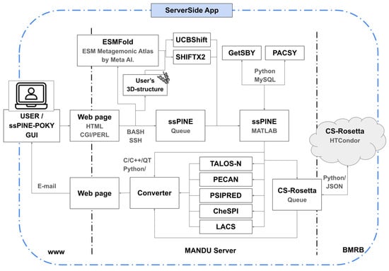 ssPINE-POKY software was developed using Python, Bash, and HTML and is integrated with our ServerSide application, which provides a secure and unified web development environment. The client–server architecture of ssPINE and ssPINE-POKY, built around the POKY framework, is illustrated in Figure 2. Users can submit jobs either through ssPINE-POKY or directly via the web page. These requests are handled by the ServerSide application, which forwards the jobs to the MANDU server—where the ssPINE backend is executed. MANDU hosts most of the POKY suite applications.
