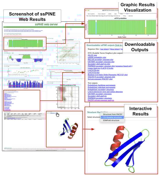 The earlier version of ssPINE included two primary tools for providing structural and dynamic parameters: PECAN (Protein Energetic Conformational Analysis from NMR chemical shifts) for protein secondary structure prediction [39] and LACS (Linear Analysis of Chemical Shifts) for chemical shift referencing errors [40]. In contrast, ssPINE-POKY integrates several additional analysis tools. These include RCI-S2 (random coil index order parameter value) for predicting protein flexibility [41], PACSY hydrophobic core prediction based on hydrophobicity scales derived from solvent-accessible surface area [42], and GetSBY secondary structure prediction, which utilizes chemical shifts of N, HN, Cα, Cβ, CO and Hα in the protein backbone [19]. Additionally, PSIPRED [43] predicts secondary structure based on the position-specific scoring matrices generated by PSI-BLAST [44], while TALOS-N applies a chemical shift-based method to predict secondary structure [41] and protein backbone φ/ψ dihedral angles, also visualized as PACSY RAMA plots [45]. For 3D structure prediction, ESMFold uses the primary protein sequence [46], and CS-Rosetta uses the chemical shifts.