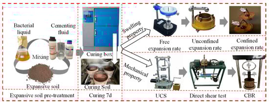 The overall test procedure, encompassing the preparation of soil samples, application of MICP treatment, and subsequent testing for swelling properties and mechanical properties, is systematically illustrated in Figure 1.