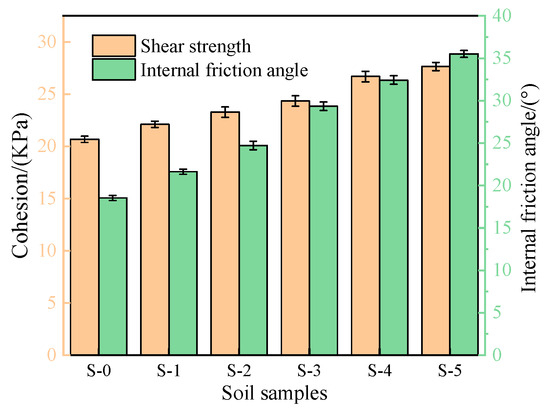 The direct shear test results for the S-0 to S-5 soil samples are shown in Figure 5. As the cementation solution concentration increased, the cohesion increased from 20.67 kPa to 27.65 kPa, an increase of 33.76%, and the internal friction angle increased from 18.53° to 35.52°, an increase of 91.67%. The rate of change in the cohesion and internal friction angle exhibited a rapid increase at first, followed by a slower increase. The S-3 soil sample, corresponding to a cementation solution concentration of 1 M, was the turning point for the change in the compaction characteristics of the MICP-treated expansive soil. When the cementation solution concentration was less than 1 M (S-0 to S-3), the increases in cohesion and the internal friction angle were 17.77% and 58.33%, respectively. When the cementation solution concentration was greater than 1 M (S-3 to S-5), the increases in cohesion and the internal friction angle were 15.99% and 33.34%, respectively.