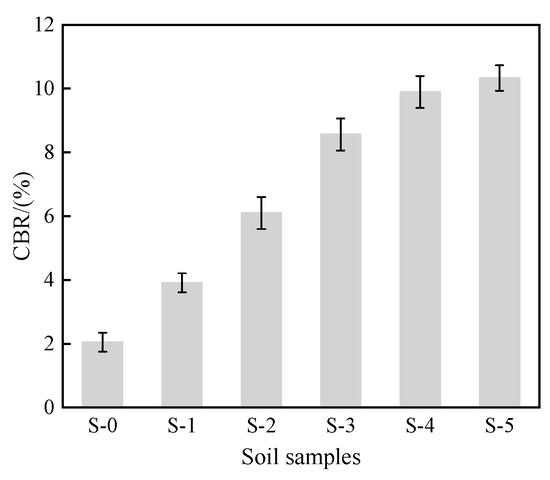 The CBR test results for the S-0 to S-5 soil samples are shown in Figure 6 and Figure 7. The CBR value increased from 2.05% to 10.33%, an increase of 403.90%. A minimum value point occurred at a cementation solution concentration of 1 M, with the S-3 soil sample having a CBR value of 8.56%, which already meets the requirement for the highway subgrade filler CBR value in China. The load expansion rate results show that the S-1 to S-5 soil samples had a significantly lower load expansion rate compared to the S-0 soil sample, with a reduction of ranging from 13.40% to 61.44%. The overall change rate of the load expansion rate for the S-0 to S-5 soil samples exhibited a rapid decrease at first, followed by a slower decrease. When the cementation solution concentration was greater than 1 M, the decrease in the load expansion rate slowed down significantly.